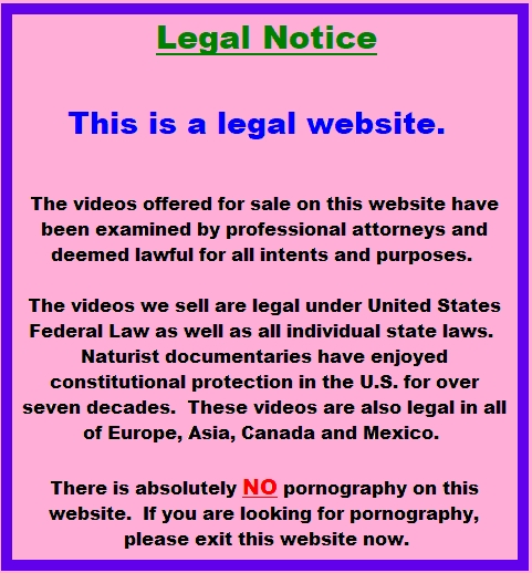 The naturist photo and video documentaries that we offer are legal in every city, every state and every county inside the United States. They are protected by the First Amendment and are not subject to local obscenity laws or ordinances. The depiction of adults and children nude in the visual media has enjoyed constitutional protection in the United States since 1958, when the Supreme Court vacated a Court of Appeals finding that the Sunshine & Health magazine could be obscene (Sunshine Book Co. v. Summerfield, Postmaster General, 355 U.S. 372). The right to depict adults and children in innocent nude poses has been upheld without a pause for many decades. In case after case, the Supreme Court and lower courts have always upheld the constitutionality of "nudity without more," specifically referring to the nudist depiction as a fully constitutional form of expression. Our website is widely visited in all of Asia, Europe, South America, Canada, Australia and Africa.